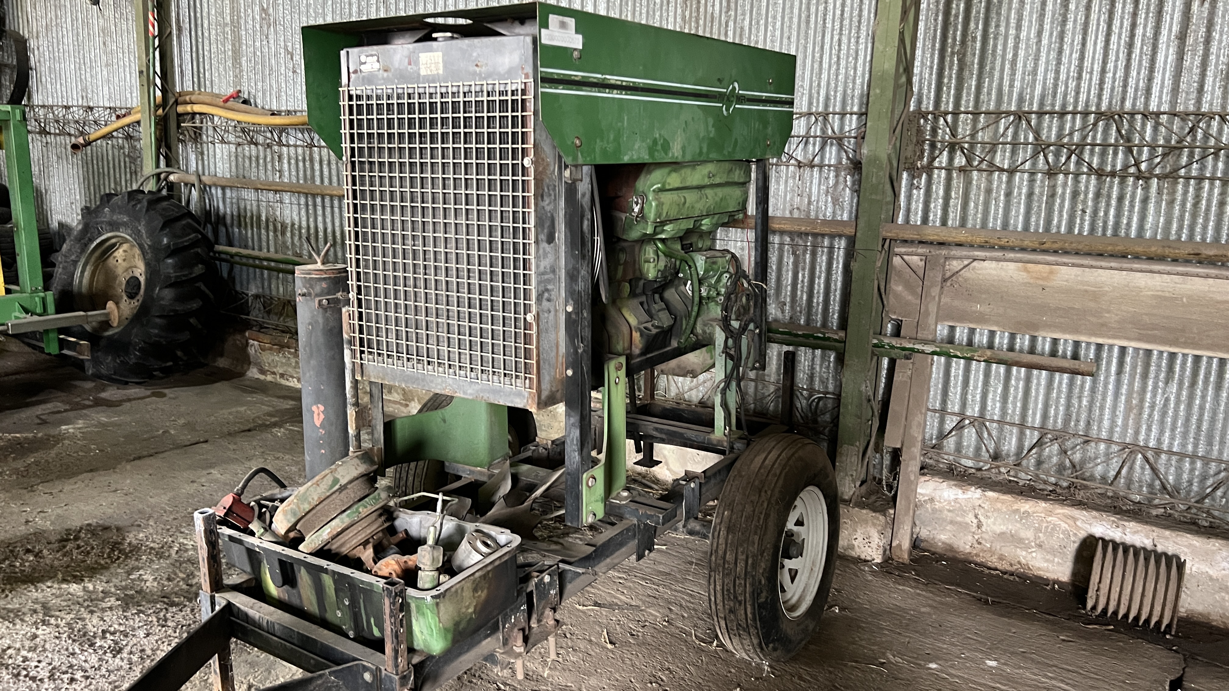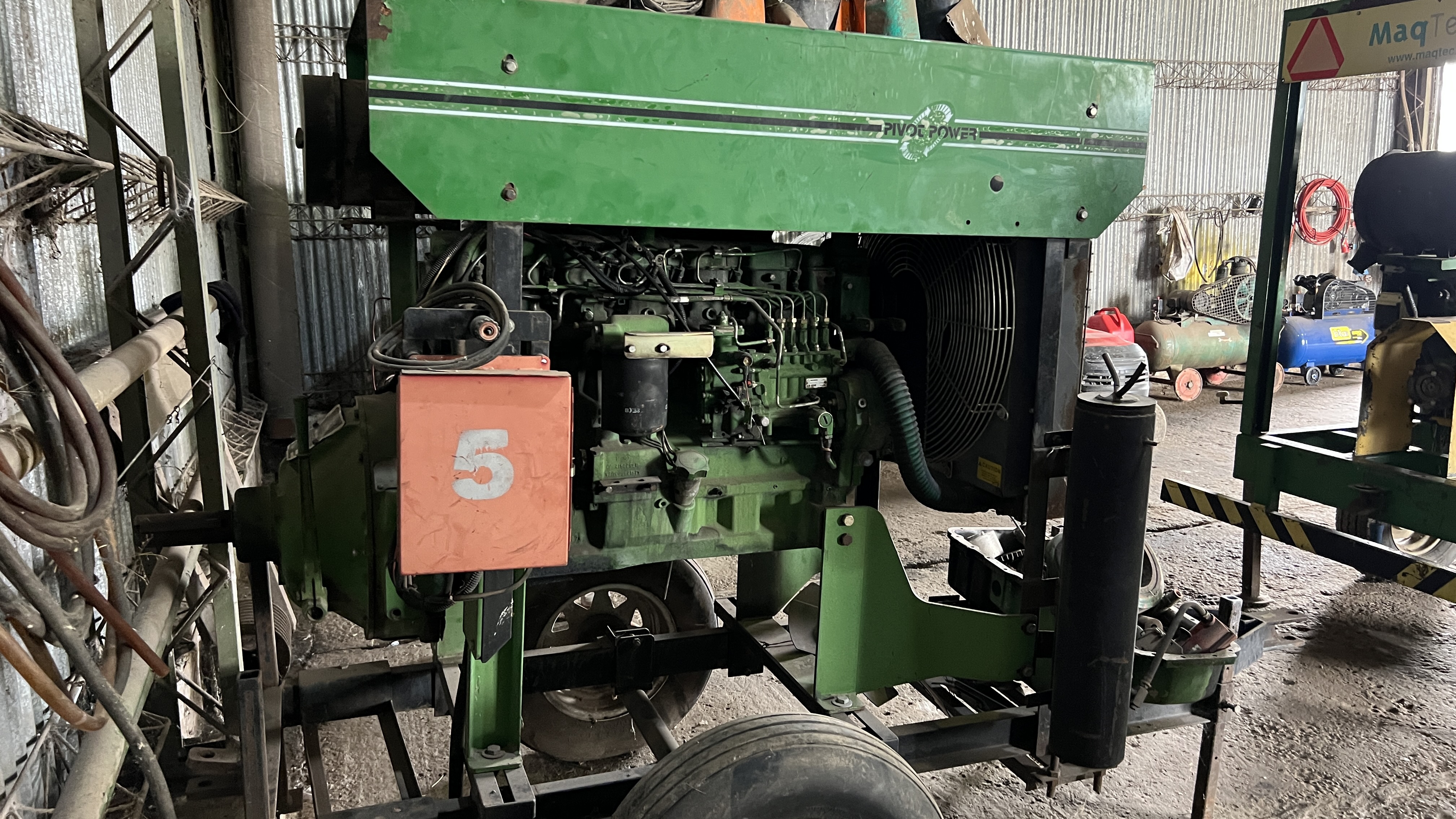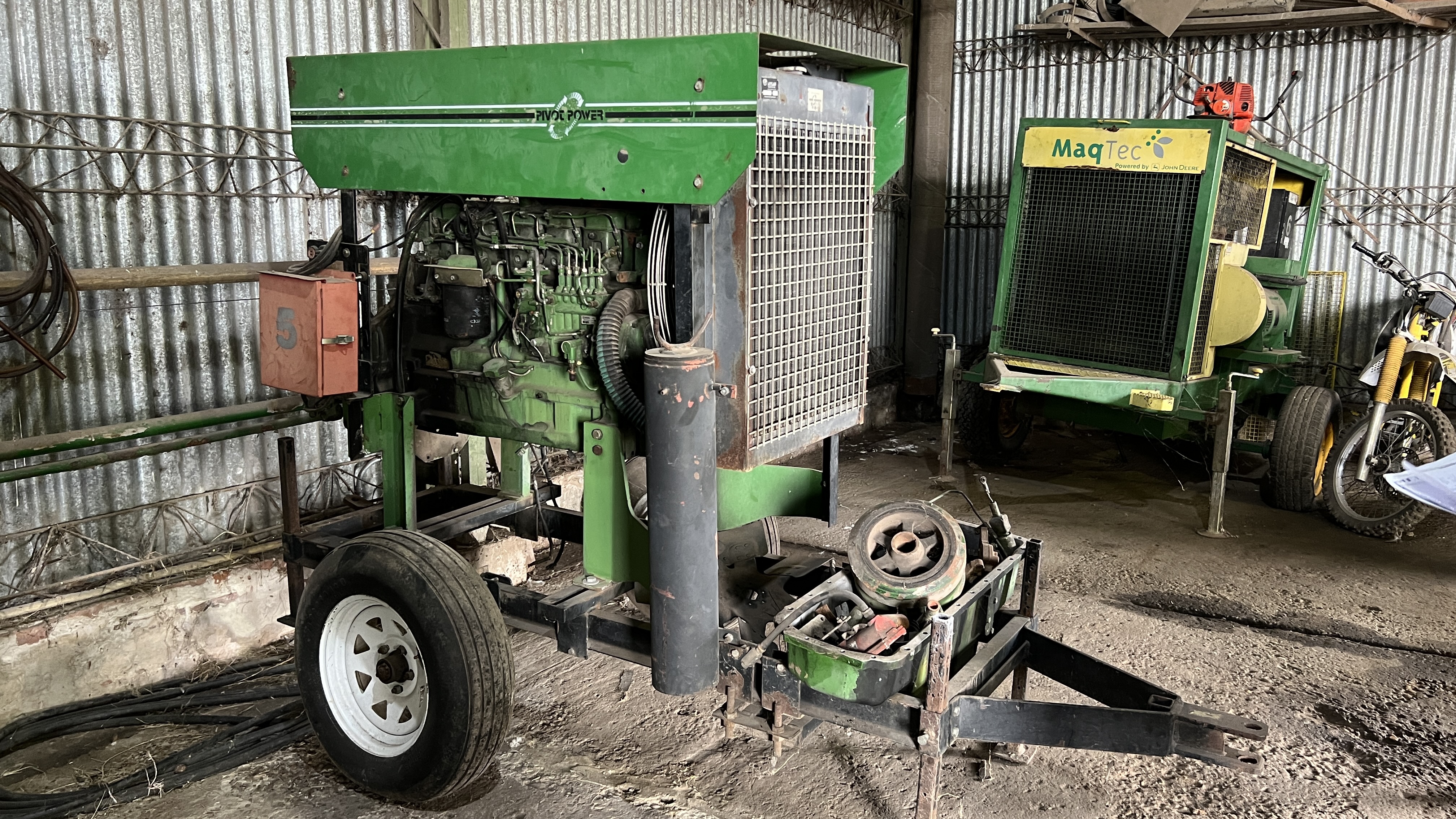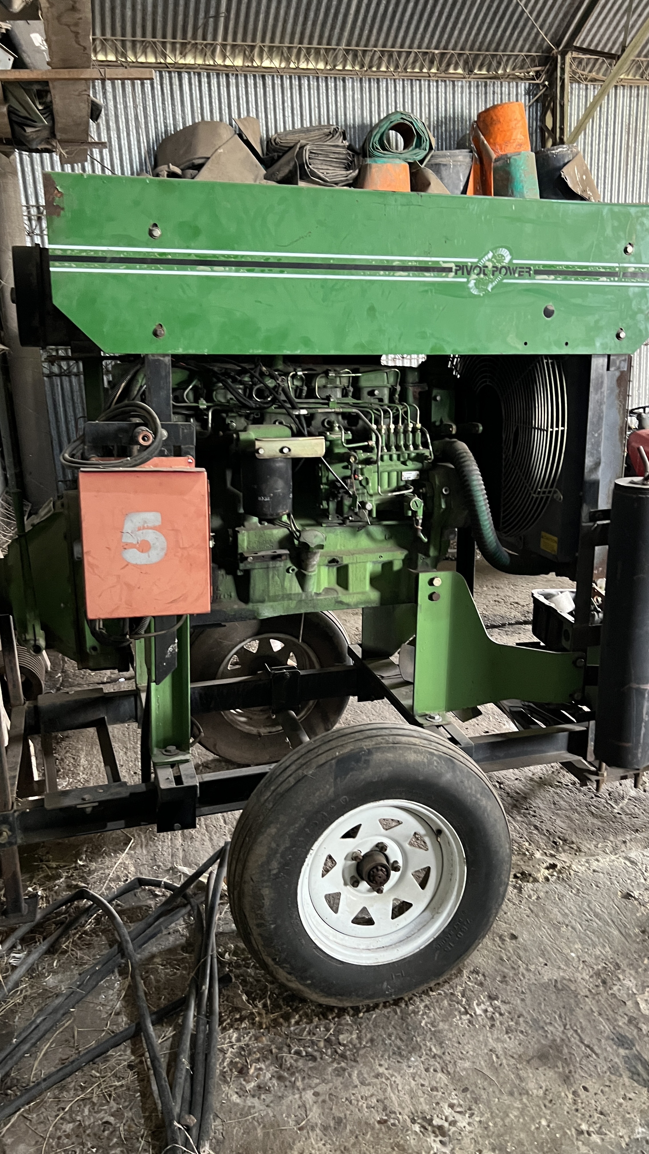 EQUIPO PARA RIEGO (PIVOT POWER) SOBRE TRAILER, VER SI LE CAMBIAN LAS CUBIERTAS - CON MOTOR JOHN DEERE Nº RG6081A179353 - CON FALTANTES. |
